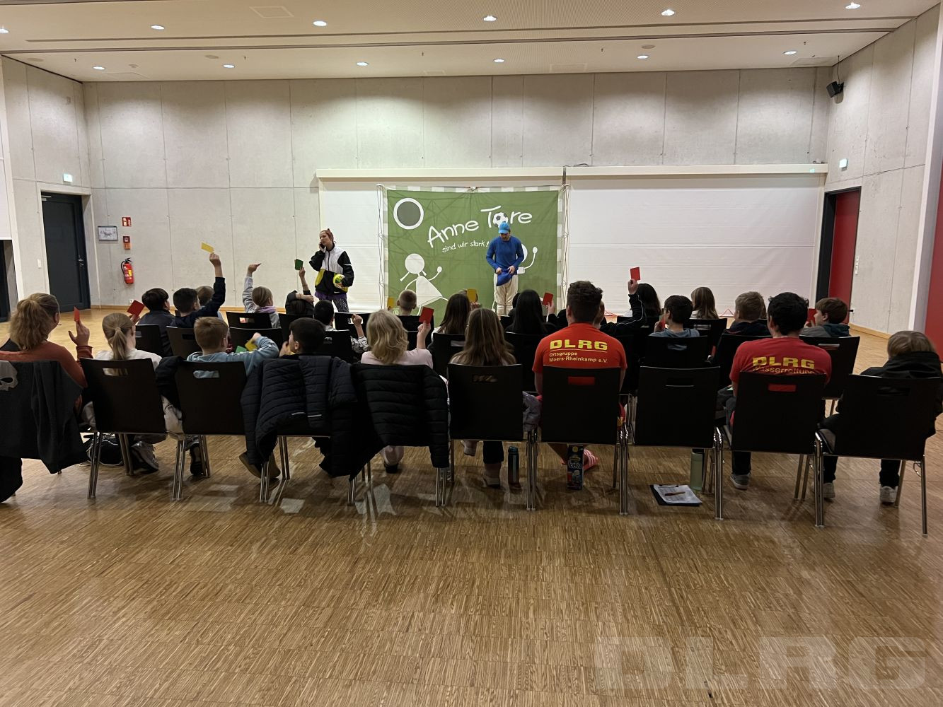 Im ENNI Sportpark Rheinkamp wurde heute das interaktive Theaterstück „Anne Tore – sind wir stark!“ aufgeführt – ein weiterer bedeutender Schritt der DLRG Ortsgruppe Moers-Rheinkamp e.V. auf dem Weg in das Qualitätsbündnis zum Schutz vor sexualisierter Gewalt im Sport. Die Schauspieler Rosalie Linneweber und Alex Welp brachten die Inhalte eindrucksvoll auf die Bühne und sensibilisierten Kinder im Alter von 8 bis 11 Jahren für Grenzverletzungen, Selbstbestimmung und ein starkes „Nein“.